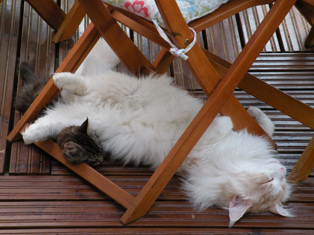 Meidän Maine Coonimme Ron ja piskuinen pentumme Spirit tykkäsivät köllötellä verkotetulla terassilla kesähelteillä. Kissamme nauttivat lämpimästä kovasti!