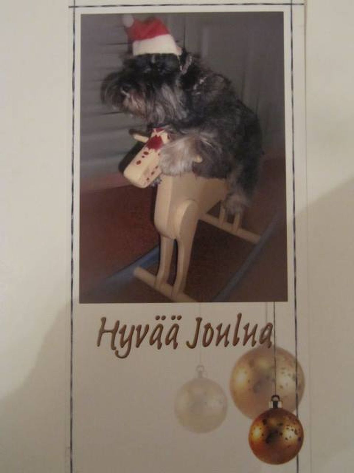 Kuva on nyt kuvasta otettu muutaman vuoden takainen joulukortti kuva, mutta myös alkuperäinen kuva on saatavailla. Toivo koira joka keinuu lakki päässä keinuhevosella elää ja voi edelleen hyvin! :)