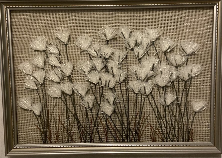 Edesmennyt äitini oli hyvä tekemään käsitöitä ja teki minulle tällaisen kuultokuvan ,jossa on tupasvilloja.