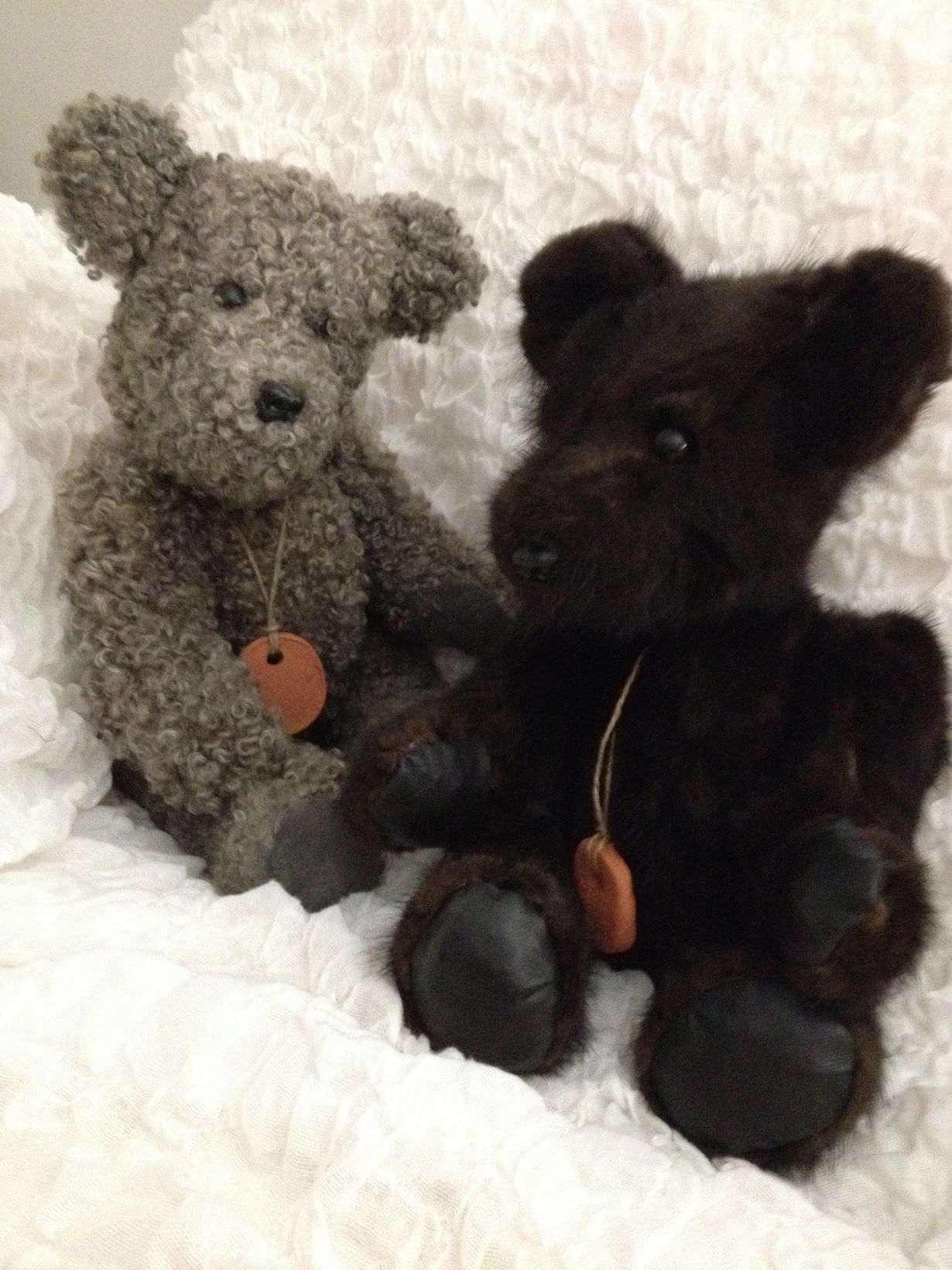Vanhoista turkeista valmistetut nallet. Harmaa lammasturkkista ja tumma minkkipalaturkkista.