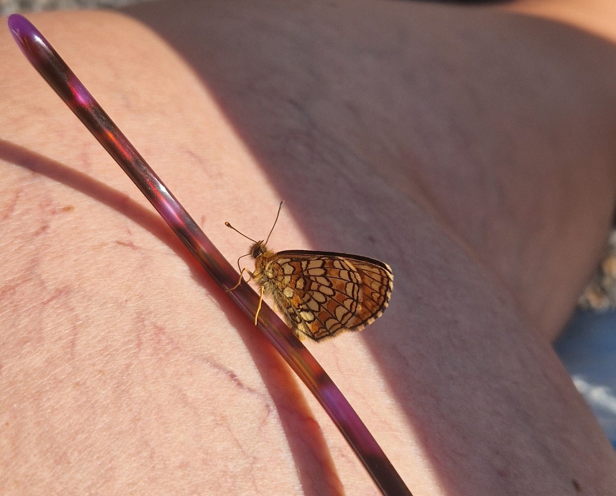 Otin mökillä aurinkoa ja perhonen istui sormelleni pari kertaa. Sitten se lensi pääni päälle ja lopuksi jäi silmälasieni sangalle heiluttelemaan siipiään.