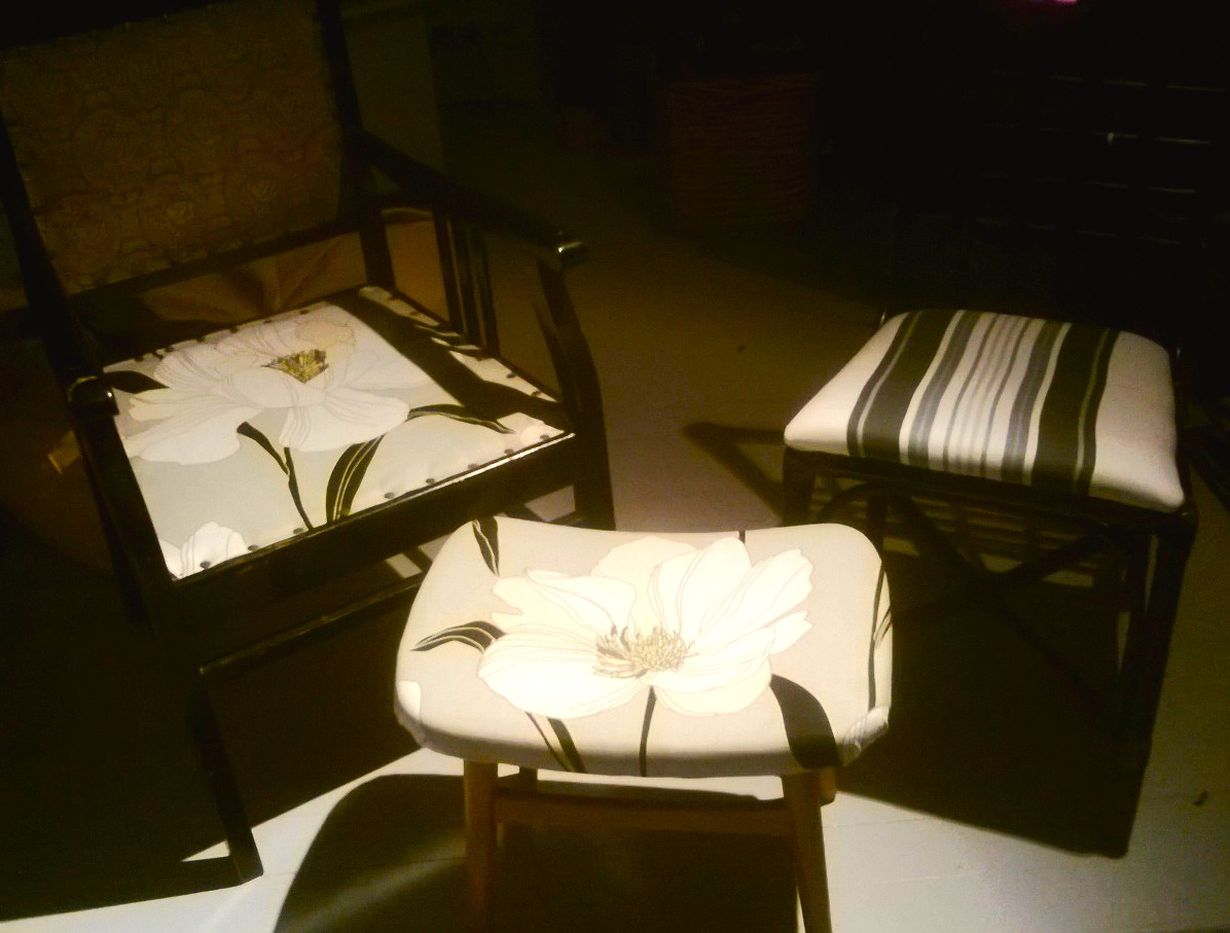 Mummolta perityt rakkaat tuolit saavat uuden elämän tuunauksella. Vaikka kuosit ovat erilaiset niin sävymaailma sitoo tuolit kokonaisuuteen.