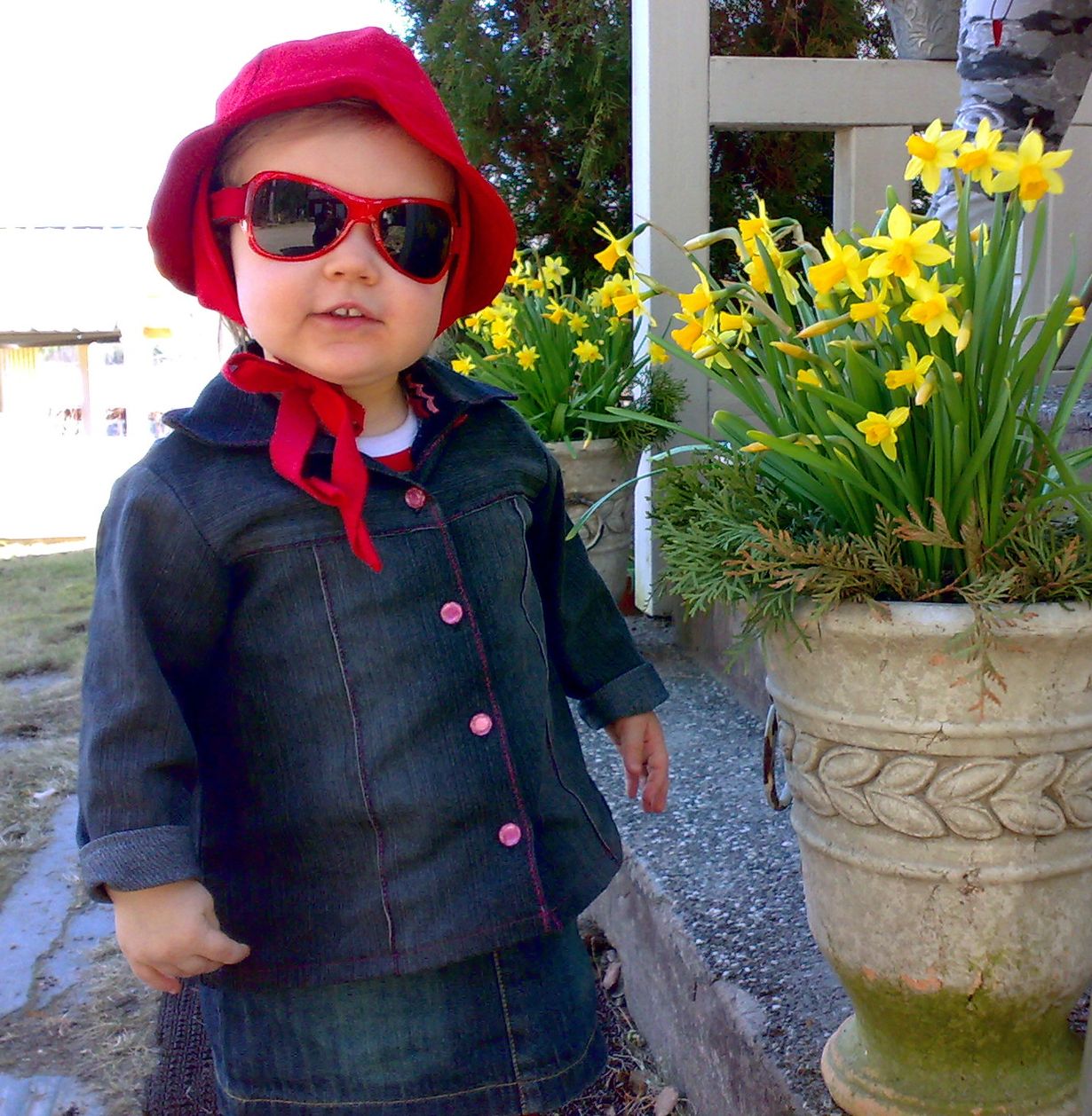 Tyylilyyli äidin vanhoista farkuista ommellussa farkkutakissa 3. Farkku oli ohuehkoa, pehmeää ja joustavaa, joten se sopi täydellisesti pikku tyttösen takkiin.
