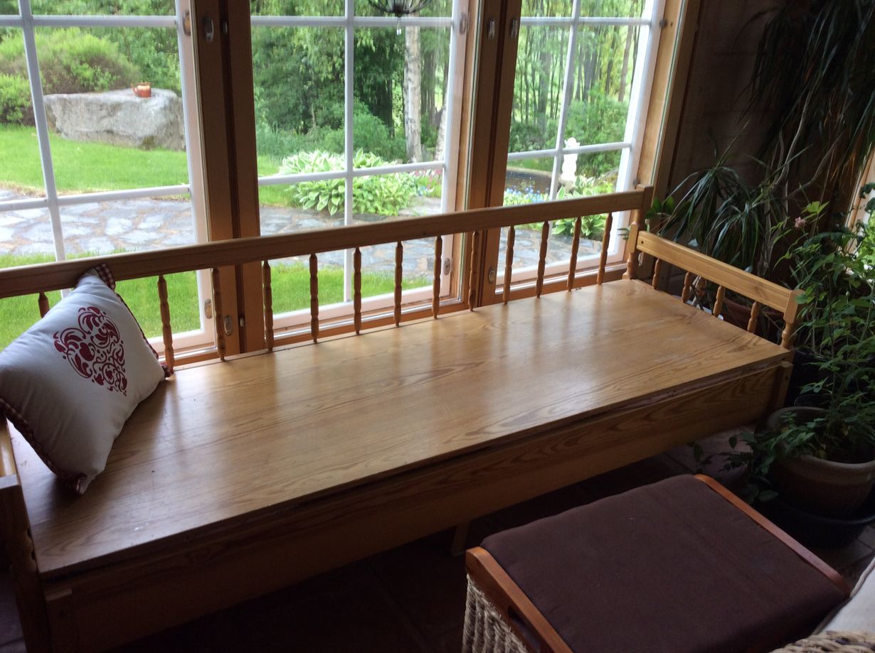 Sänky on perujaan miehen mökiltä ja nyt se on saanut arvoisensa paikan meidän viherhuoneessa.. Kesäisin ja talvisin toimii vieraspetinä ja joskus itsekin tulee siinä otettua päivänokoset, istuskeltua lukemassa kirjaa tai ihailla ympärillä olevaa vihreyttä
