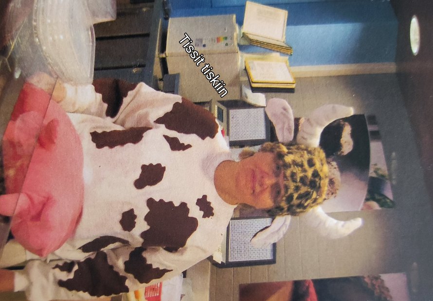 Työpaikallani, K-supermarket Artomarket(Nilsiä)on tapana pukeutua vappuaattona hassuihin asuihin. Tämä asu on muutaman vuoden takaa. Olin töissä palvelutiskillä ja eräs asiakas kysyi,onko meillä lihapäivät. Useampikin asiakas halusi vedellä vetimistä.