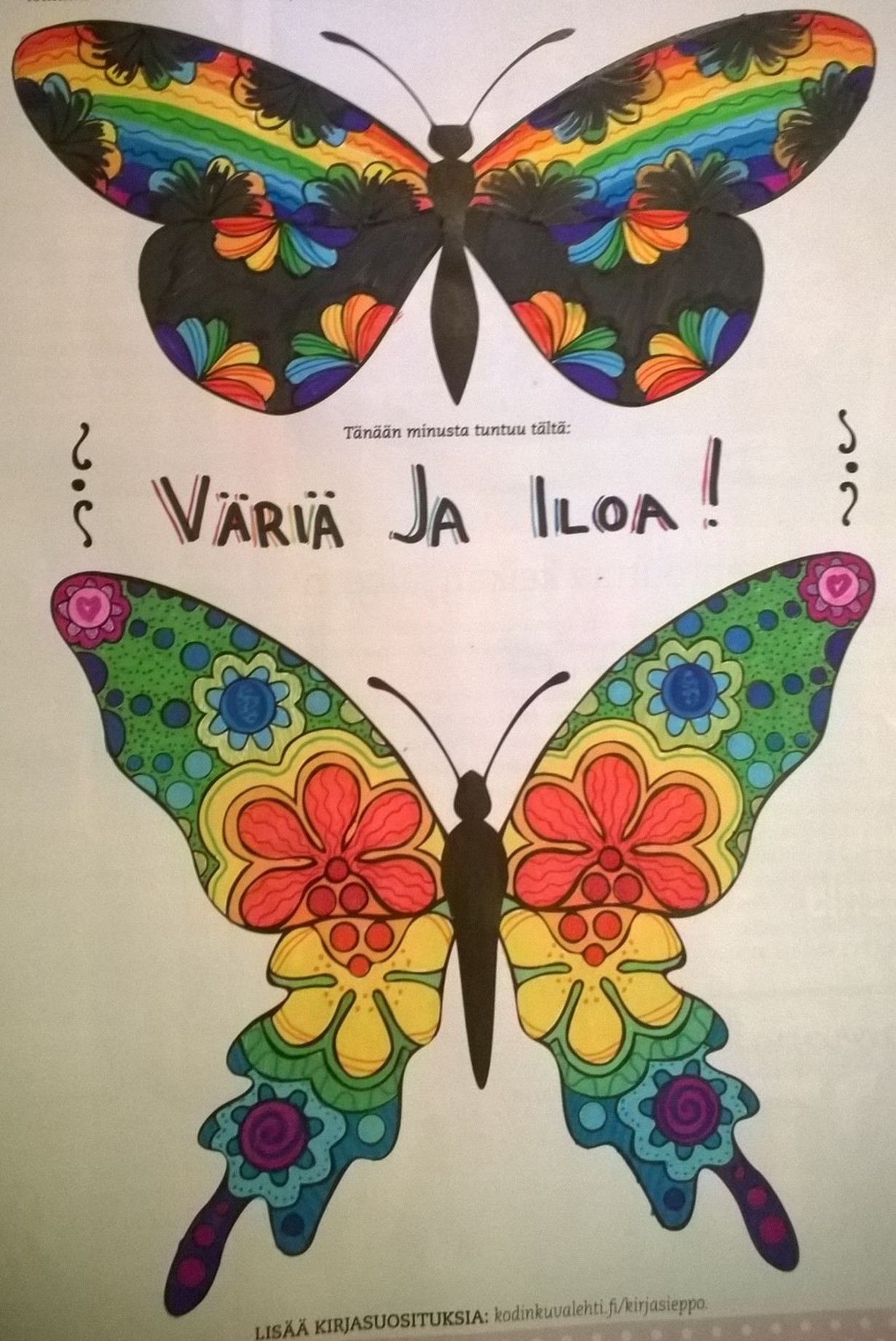 Mielenrauhaa aikuisten värityskirjasta - väritä perhoset ja voita! Väriä ja iloa! 5.8.2015 klo 19:51 <3