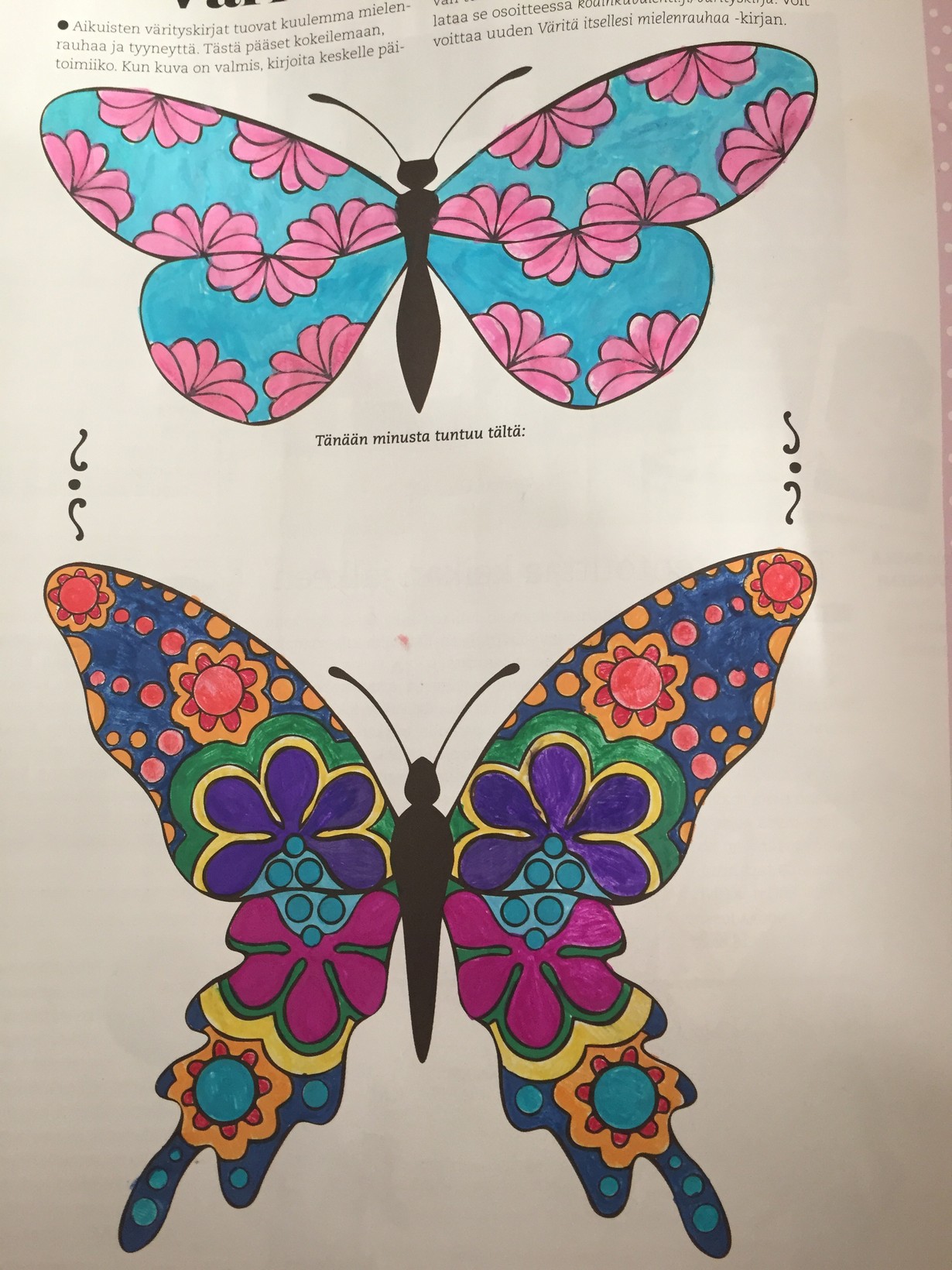 Mielenrauhaa aikuisten värityskirjasta - väritä perhoset ja voita! Värittelen ilman päämäärää 4.8.2015 klo 19:24 Meinasi tussit loppua :)