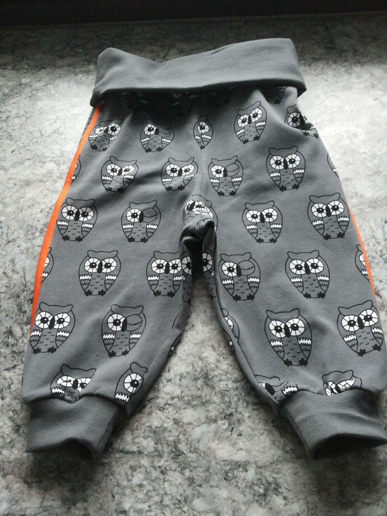 Pöllökankaasta ommellut trikoohousut, koko muistaakseni 84cm. Vyötärön resori jatkaa käyttöikää. En omista saumuria, mutta siisti ja kestävä ommel tuli siksak-ompeleellakin.