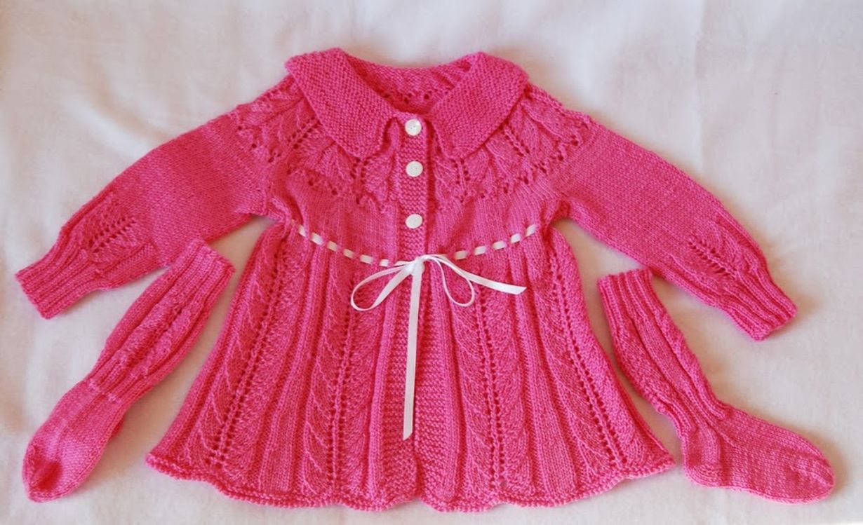 Neulottu villatakki pienelle tytälle, polvisukissa samaa pitsinneuletta. Lankana Lanet (100% merinolanka), asun koko n. 68 senttiselle.