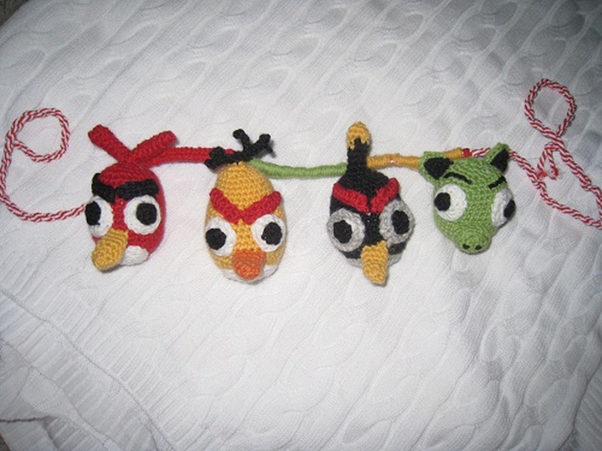 vauva katseli vihaisten lintujen mukaan tehtyjä lapasia silmät ymmyrkäisinä. siitä ponnahti ajatus tehdä vauvalle omat rapisevat ja kilisevät linnut vaunuihin katseltavaksi. vauva tykkää!
