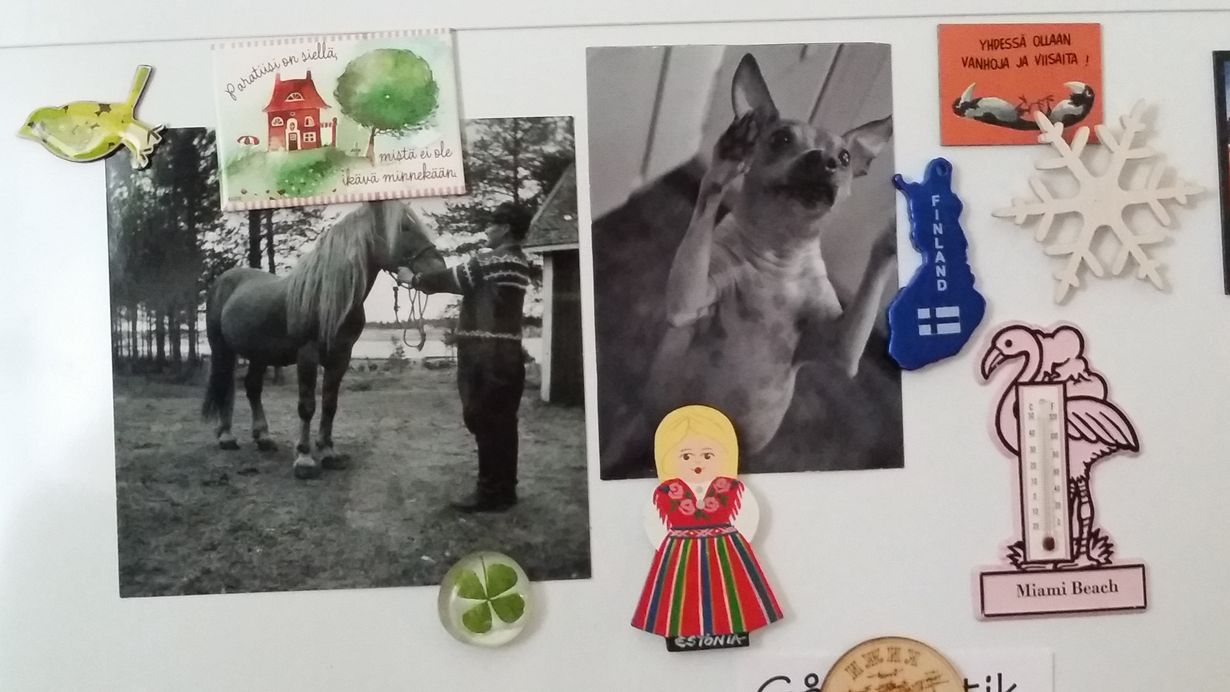 Pappa ja hänen hevosensa 70-luvulla, Dante tyttäreni Amerikkalainen alastonterrieri, Eestistä kansallisipukuinen nukke, neliapila Saksasta, Suomesta kartta, Miami beachiltä flamingolämpömittari, lumihiutale serkultani ja varikset äidiltäni.