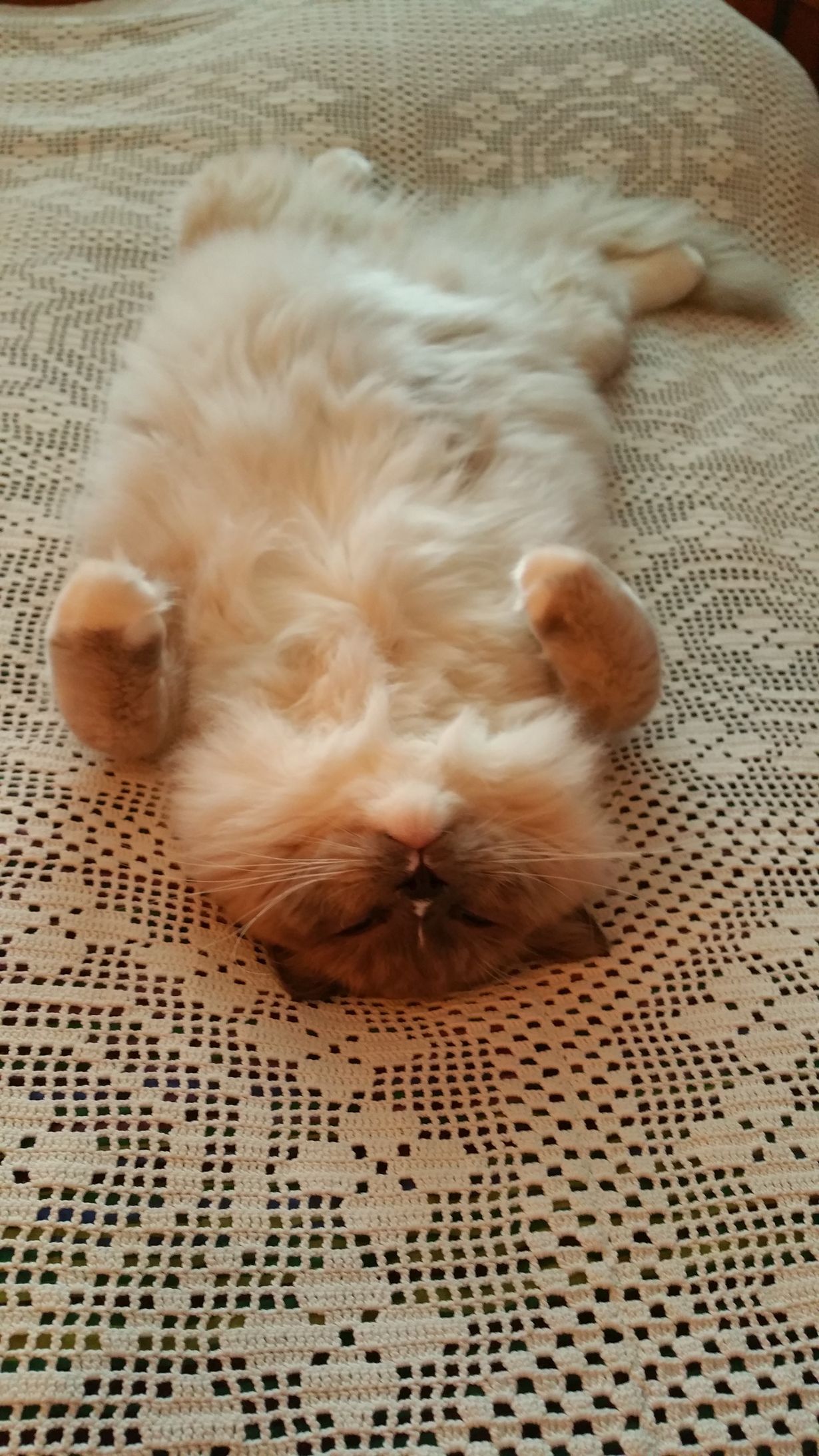Viiru 1 v. tykkää nukkua yleensä selällään. Sängyssä, silloin kun siellä ei ole kuin korkeintaan naispuolinen palvelija, tai sitten keittiön pöytäkin käy vallan mainiosti. Nukkuminen on oikein mukavaa :).