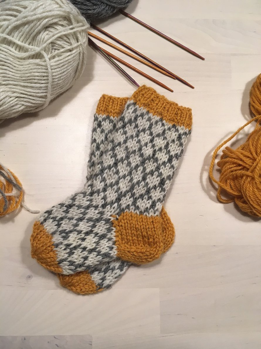 Sisko sai esikoisen ja tein hänelle omien villasukkieni jämälangoista pikkuiset kuviosukat