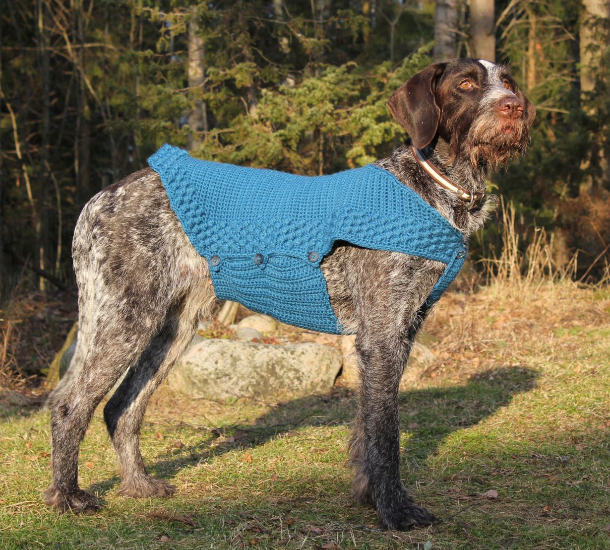 Innostuksen koirantakkiin ystäväni koiralle sain Susan Cropperin kirjasta "Virkkaa uusvanhaa", kirjan malli on pienelle koiralle. Tein oman mallin ja ystäväni sovitti takin työn edistyessä. Lopputulos on minusta aika kiva. Reunojen pallosilmukat ovat