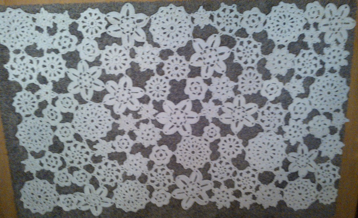 Virkkasin pojalleni ja miniälleni lahjaksi valkoisesta trikookuteesta makuuhuoneeseen maton. Matto on tehty erilaisista kukkapaloista jotka on liitetty yhteen ompelemalla. Maton koko on 200 x 120 cm.