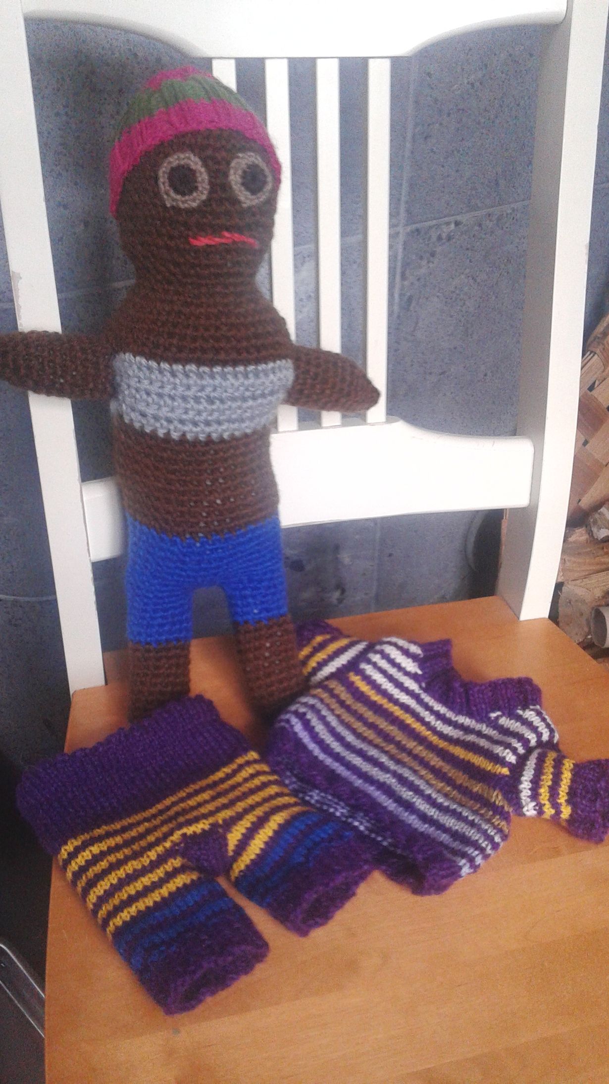 Keksin mollamaijaidean kun halusin päästä eroon jämälangoistani.Aloitin virkkaamisen päälaelta ja tein koko mollamaijan yhtenä kappaleena. Vaatteet on neulottu.