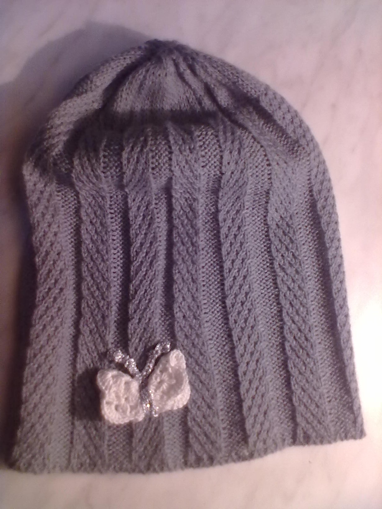 Tämä myssy loytyi ale-korista yhdellä eurolla.Ohut myssy kevääksi lapselle.Mutta kovin oli tylsän näkoinen,joten se sai perhosen(virkatun) piristykseksi ja pikkuneiti tykkäsi:)