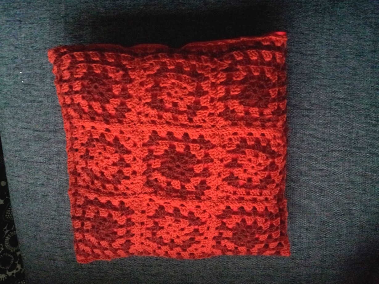 Jämälangoista virkatuista isoäidinneliöistä ommeltu vetoketjullinen tyynynpäällinen. Pirteistä väreistä virkattu isoäidinneliötyyny on kuin valopilkku olohuoneen sisustuksessa.