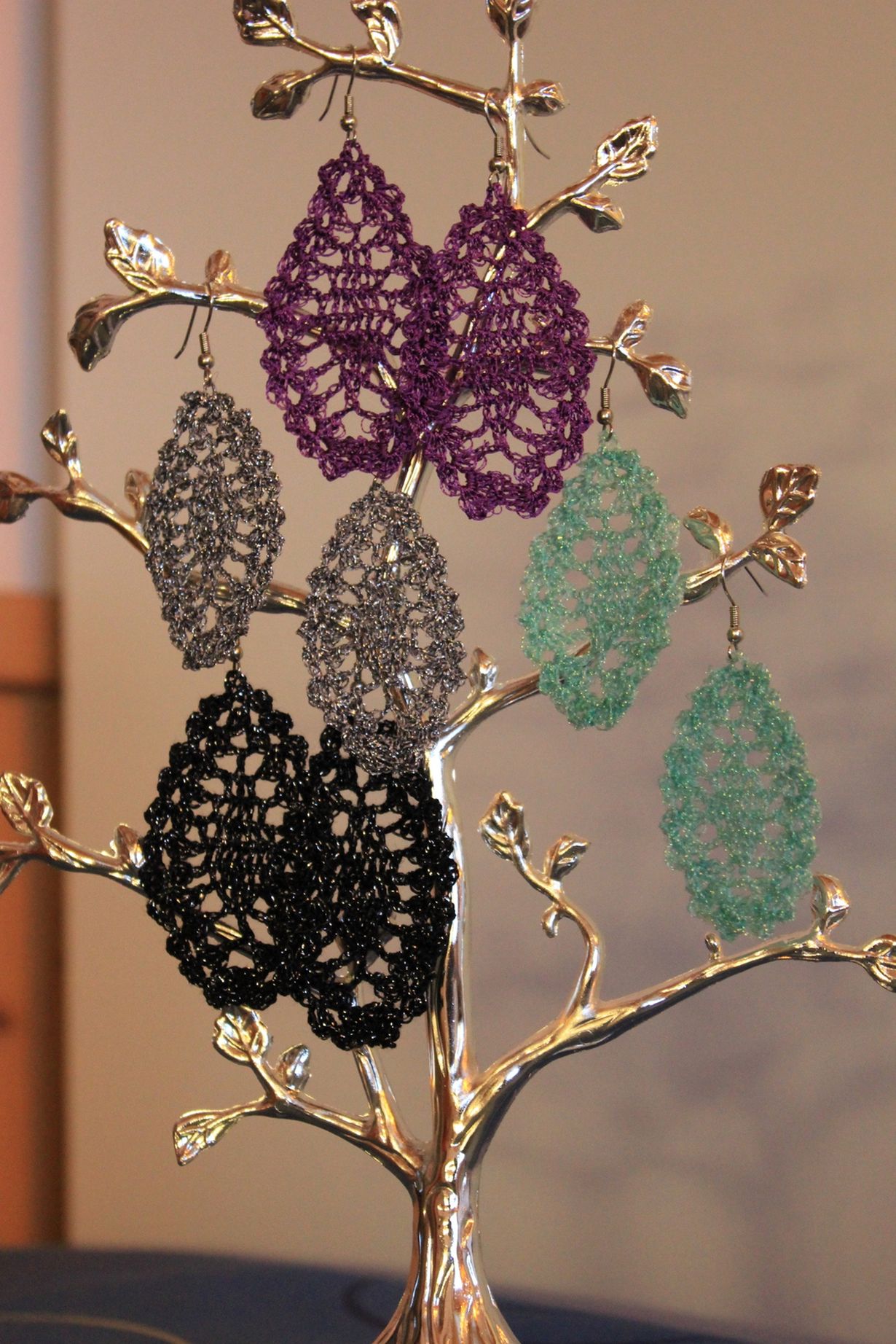 Työkaverini kävi Italiassa messuilla viime keväänä (2012) hän soitti sieltä, että nyt ovat virkatut korvakorut muotia. Hieman vitsinä heitti, että hänelle voisin tehdä turkoosit ja salmiakin malliset... No niiden turkoosien jälkeen on tullut tehtyä aika monelle työkaverille korvakorut ja mikä siinä on tehdessä, sillä aika nopeaa näin pienen valmistuminen on. Vaikka se virkataankin kaksinkertaisesta konekirjontalangasta. Joka kerta vain malli hieman muuttuu. Tässä viimeisimmät :)