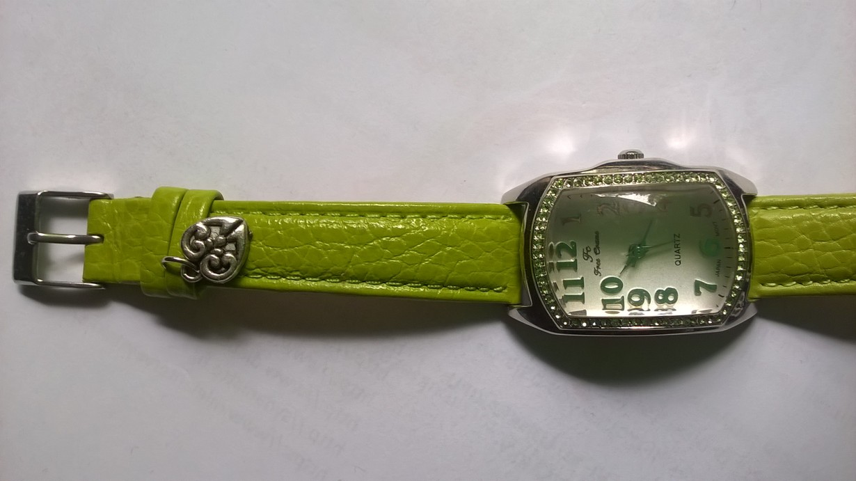 Sain tämän bling bling- kellon ystävältäni, joka ymmärsi intoni limenvihreään. Ystävä menehtyi ja kello pysähtyi. Lisäsin siihen pienen sydänkoristeen ja käytän yhä kelloa. Sydänkelloa. Mittaa nyt uusia aikoja uusien ihmisten kanssa <3