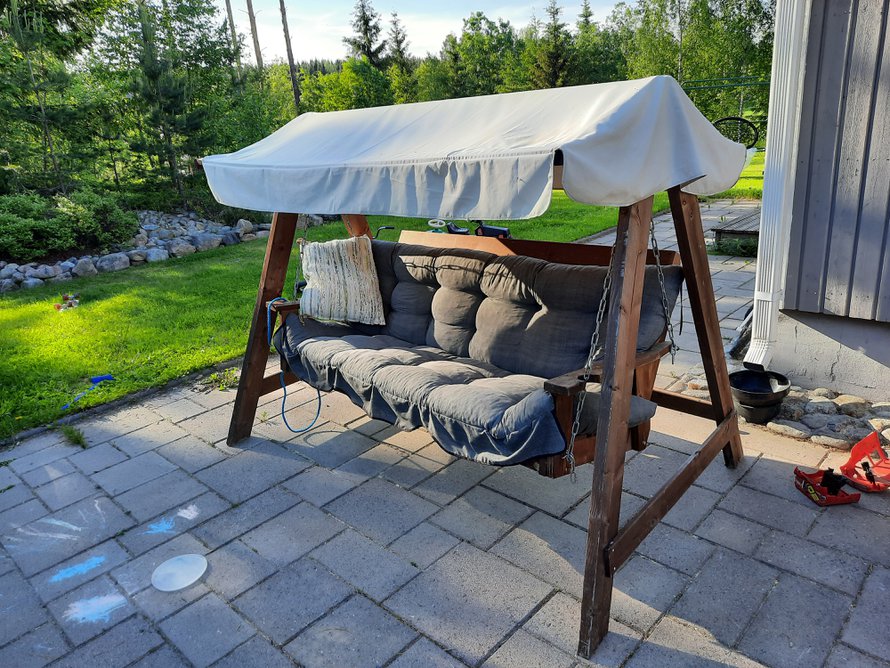 Olin haaveillut tuollaisesta pihakeinusta jo edellisenä kesänä, mutta ne oli koko ajan Terralta loppu. Koitti kesäkuu 2017 ja odotin tytärtämme kun olin anopin kanssa shoppailemassa. Puolihuolimattomasti kysäsin Terralla käydessämme, että olisiko niitä piakkoin varastossa ja niitähän oli heti. Anoppi ei uskonut silmiään kun näppäränä tyttönä kysäsin peräkärryä lainaan ja pyysin hilaamaan keinupaketin siihen. Peruuttelin vielä auton kotipihassa kätevästi pihatasanteelle ja levitin keinun osat siihen, kasaaminen jäi miehelleni. 9 vuoden jälkeen anoppi alkaa kai pikkuhiljaa tottumaan miniänsä nopeisiin liikkeisiin.