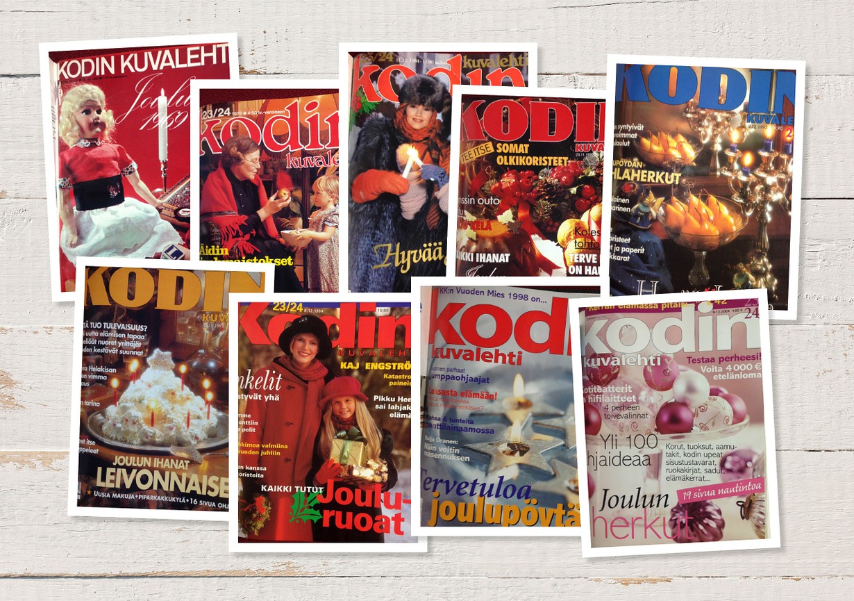 Valitsimme viiden vuosikymmenen ajalta yhdeksän erilaista Kodin Kuvalehden joulukantta. Kylläpä tyyli on muuttunut vuosien saatossa!