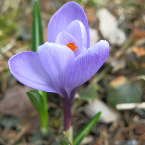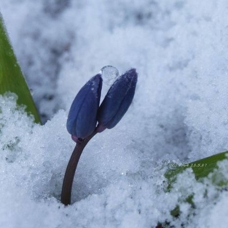 Krookus sinnittelee toukokuisen raekuuron keskellä Helsingissä Hakuninmaalla.