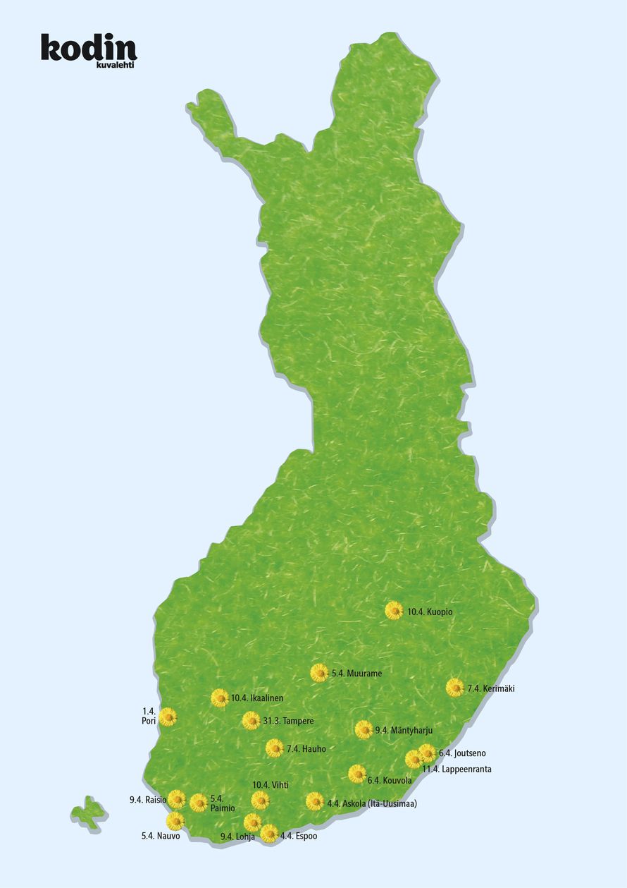 Osallistu sinäkin. Kerro havaintosi Kodin Kuvalehden Facebook-sivulla. Katsotaan, milloin koko maa kukkii!