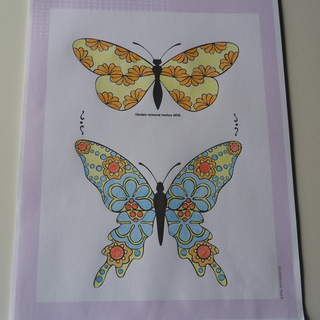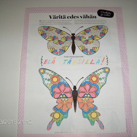Kodin Kuvalehden numerossa 15/2015 on värityskilpailu: väritä perhoset, ota luomuksestasi kuva ja lähetä se alla olevan lomakkeen kautta. Voit voittaa uuden Väritä itsellesi mielenrauhaa -kirjan. Osallistu kisaan 12.8. mennessä.