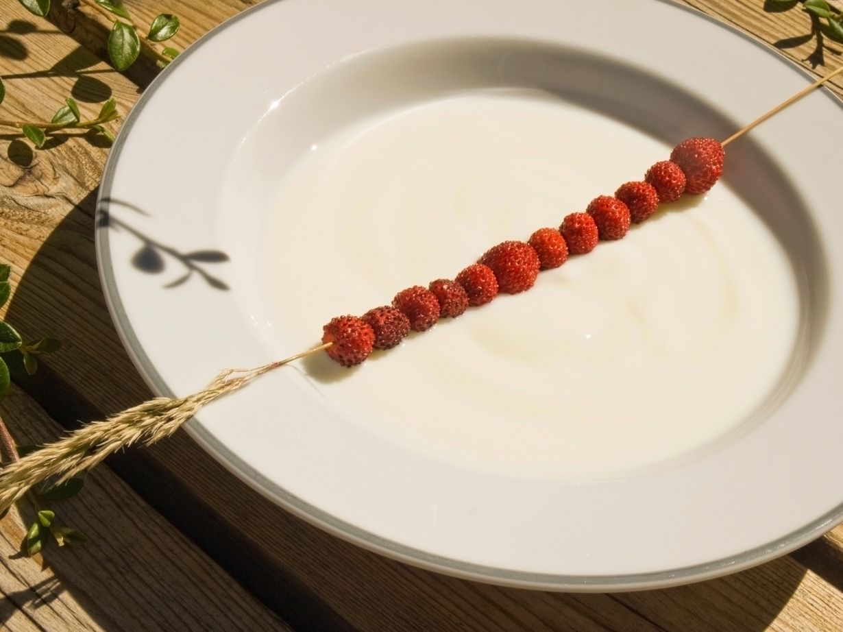 Metsämansikoiden pujotus heinään kuului lapsuuden kesiin, mutta on hauskaa edelleen. Mansikat myös syödään totta kai suoraan heinästä.