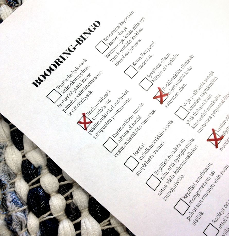 Tympiikö teatteriesitys? Tulosta mukaan kuponki ja pelaa Boooring-bingoa!