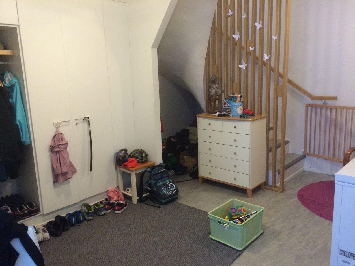 Viisihenkinen perheemme asuu kaksikerroksisessa kerrostaloasunnossa, jonka alakerrassa on tilava eteinen. Ongelma on, ettei minussa (perheen äiti) ole yhtään sisustajan vikaa, että saisin luotua eteisestä toimivan, kauniin ja siistin. Sellaisen, joka toivottaa tervetulleeksi ja johon on mukava astua kiireisen työpäivän jälkeen. Kenkärivistö pitäisi saada jonnekin piiloon. Kaipaisin järkevää ratkaisua kuramaton tilalle (nykyisen maton reunat kuprulla ja lelulaatikko toimittaa painon virkaa kuten kuvasta näkyy). Hylly tai naulakko repuille, pyöräilykypärille jne... Laskutilaa pikkutavaroille, peiliä seinälle jne... Rappusten alla oleva tila pitäisi saada paremmin hyödynnettyä. Nyt siellä on kenkätelinettä ja lasten pystynaulakkoa ja täysi kaaos! Olisin todella kiitollinen, jos voisitte auttaa eteisemme suunnittelussa niin että tilasta tulisi käytännöllinen ja kaunis!"