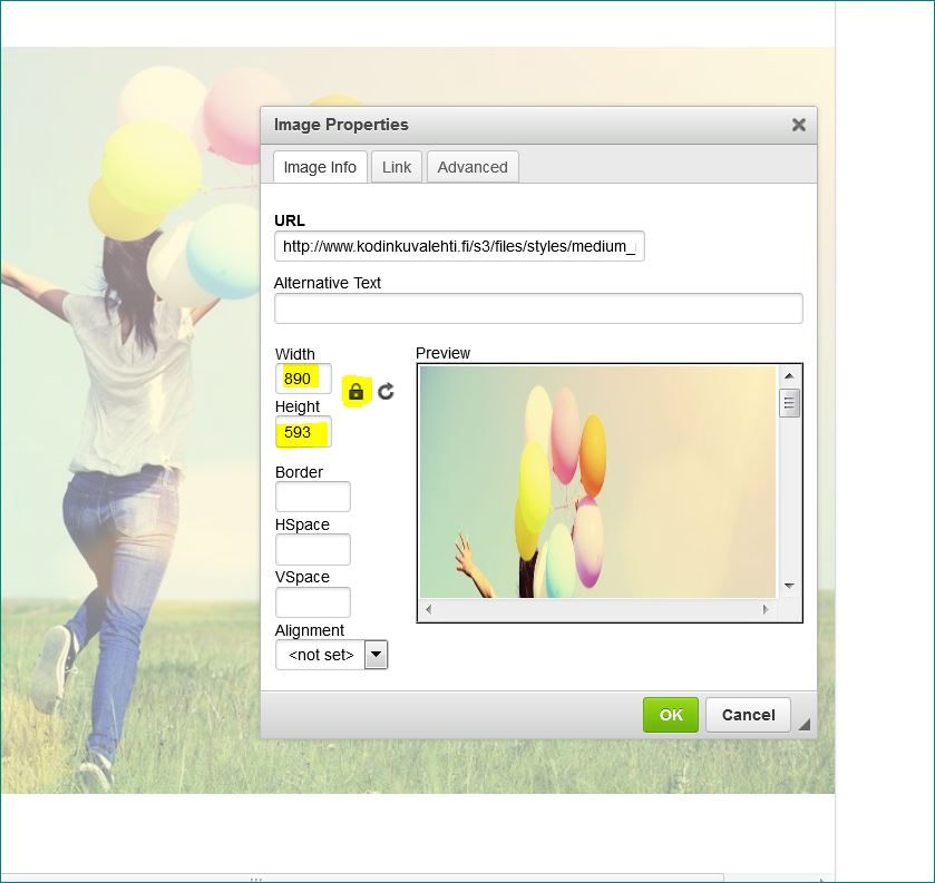 - Eteesi avautuu Image Properties -työkalulaatikko (kuvaliite blogikuva-2). Muuta kuvan leveyttä (Width) tai korkeutta (Height) tai molempia. Jos haluat säilyttää alkuperäisen kuvan mittasuhteet, klikkaa lukon kuvaa (sen pitää olla kiinni, jotta mittasuhteet eivät muutu) ja muuta vain joko leveyttä tai korkeutta.
