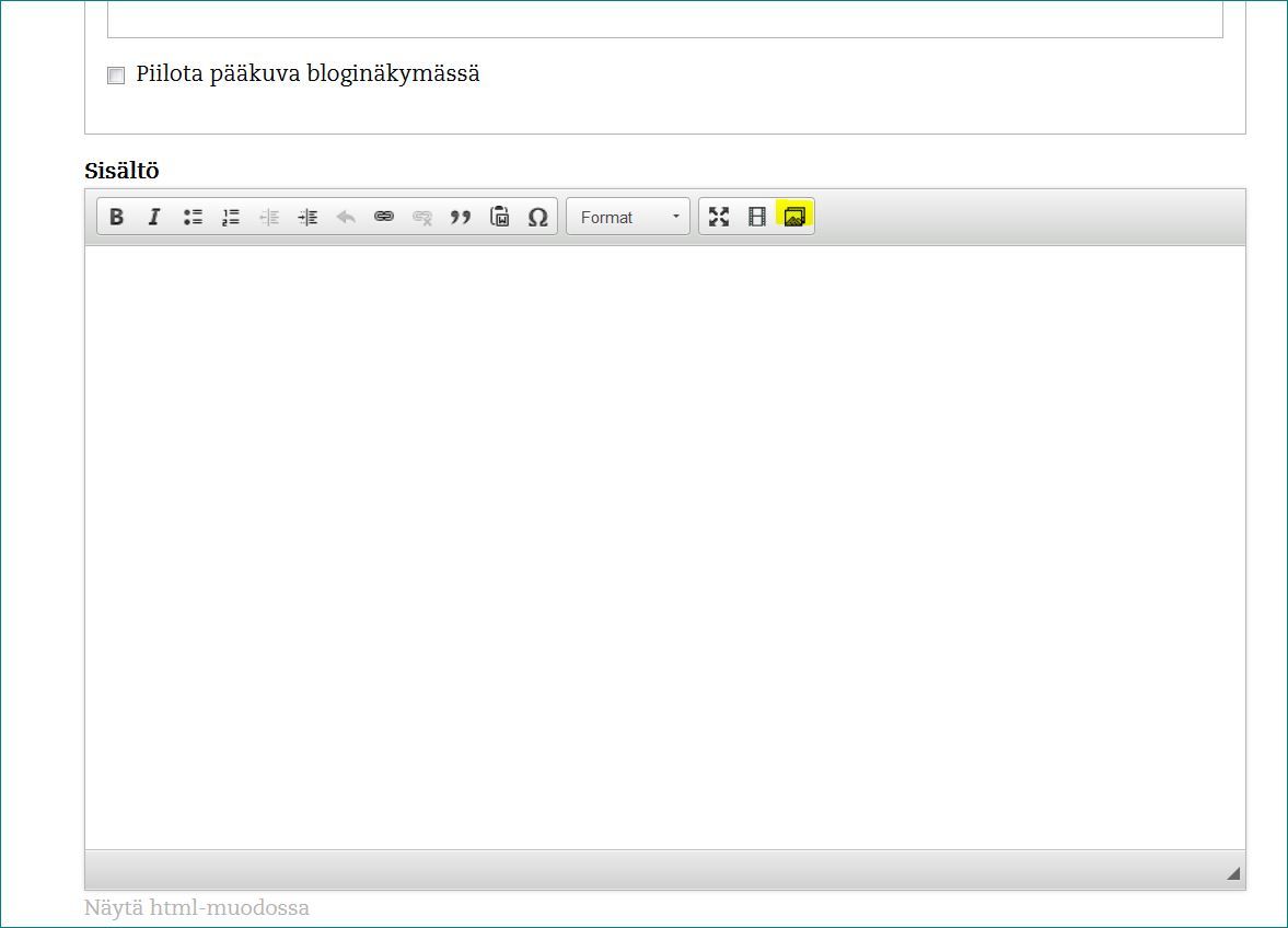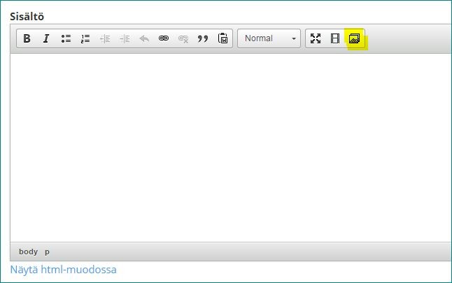 Muut kuvat voit sijoittaa tekstin joukkoon. Huom! Älä raahaa niitä, vaikka se jollakin selaimilla onnistuukin. Varmimmin kuvan lisäys onnistuu ylärivin kuvakkeesta (merkitty alakuvassa keltaisella).