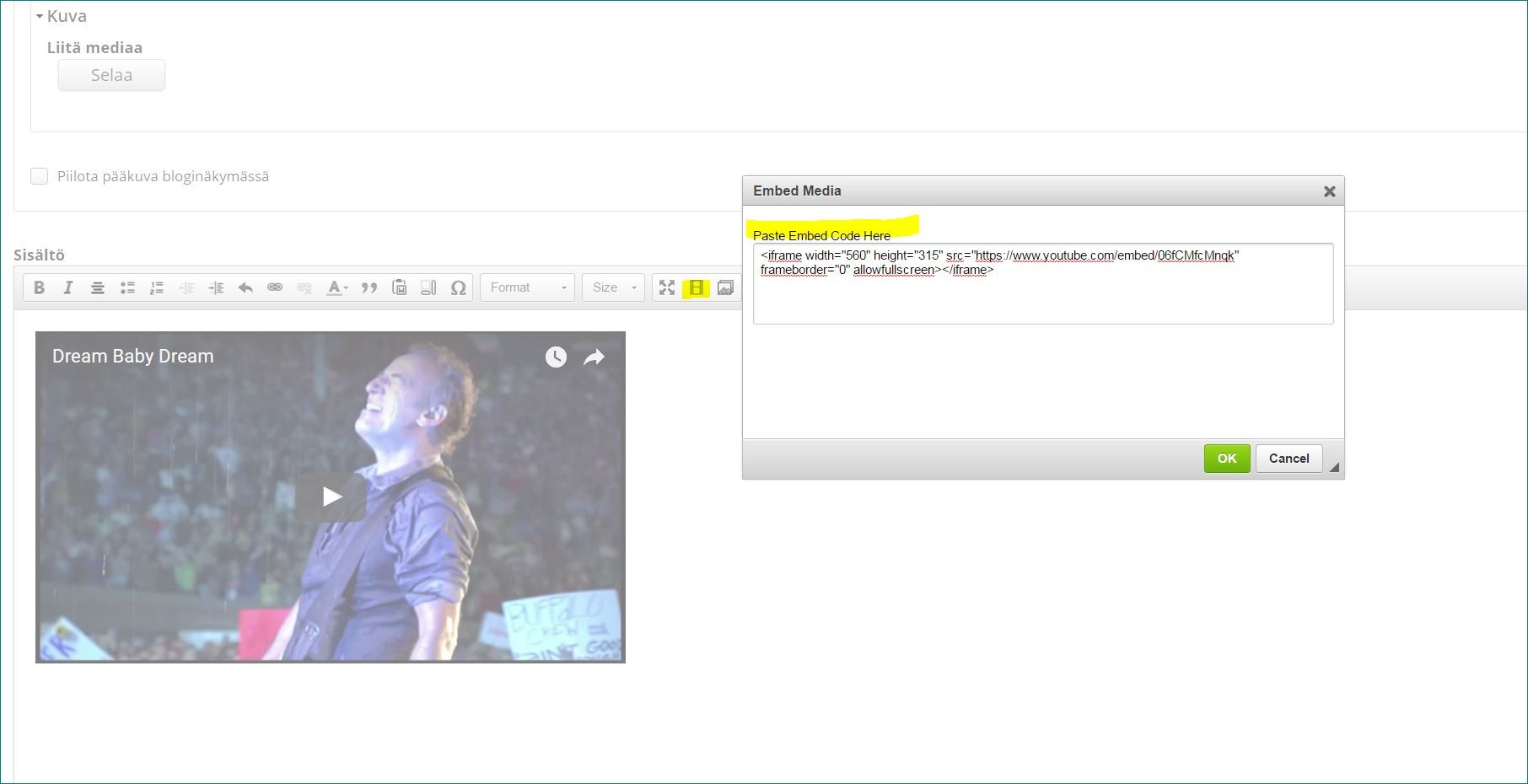 Mene sitten postaukseesi siihen kohtaan, mihin haluat videon sijoittaa, ja klikkaa tekstilaatikon yläpalkissa olevaa filminpätkän näköistä ikonia (Embed Media). Eteesi avautuu laatikko. Sijoita YouTubesta kopioimasi koodi siihen ja paina OK. Valmis! (Kuvasta näet sekä latauskohdat että sen, miltä upotettu video näyttää.)