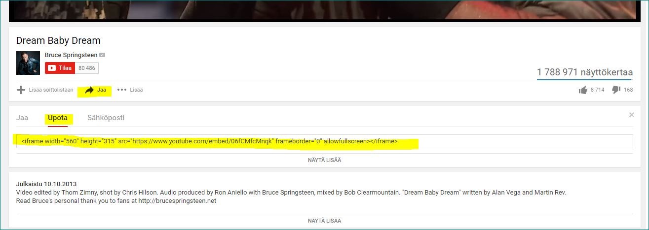 Lataa videosi ensin YouTubeen. Klikkaa sitten videon alla näkyvää Jaa-toimintoa ja valitse sitten Upota. Kopioi siitä pitkä embed-koodi (kuvassa keltaisella).