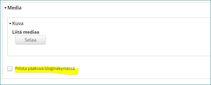Todennäköisesti olet lisännyt sen tekstikenttään. Lisää pääkuva Media-kentästä (merkitty alakuvassa keltaisella). Silloin se tulee näkyviin blogilistauksissa.