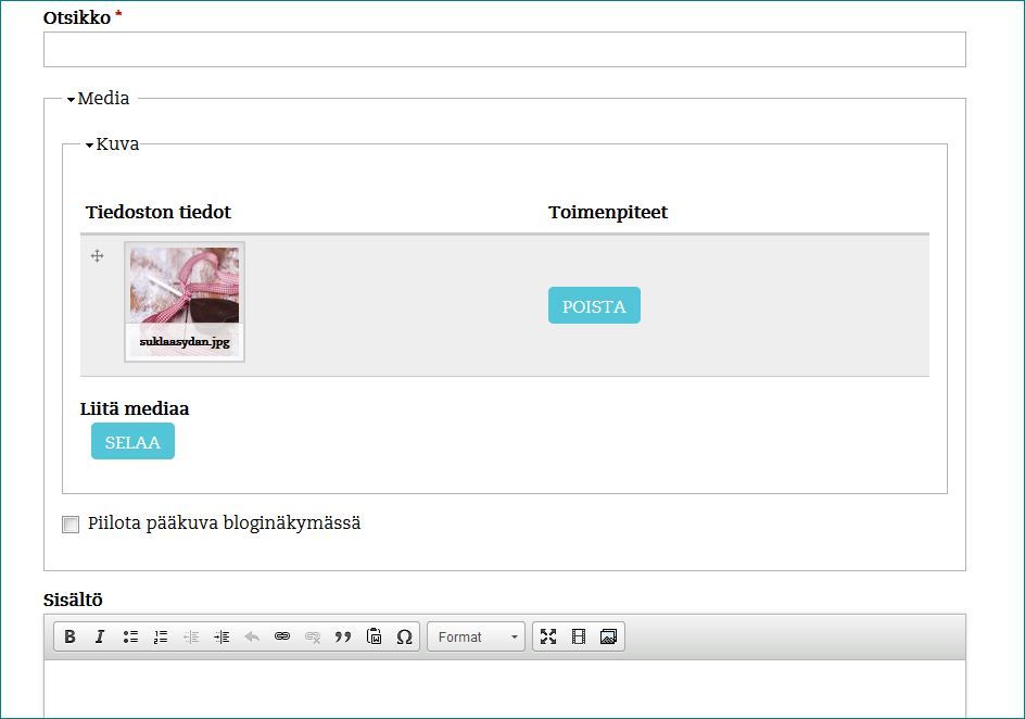 Jos kuitenkin haluat, että kuvat ovat tekstin seassa ja alekkain, lisää vain yksi kuva pääkuvaksi Media-laatikosta ja loput yllä olevan ohjeen mukaan.