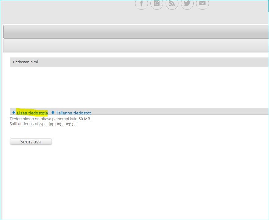 Ruudulle avautuu Tiedoston nimi -kenttä. Raahaa kuvatiedosto siihen tai lataa se Lisää tiedostoja -nappulasta.