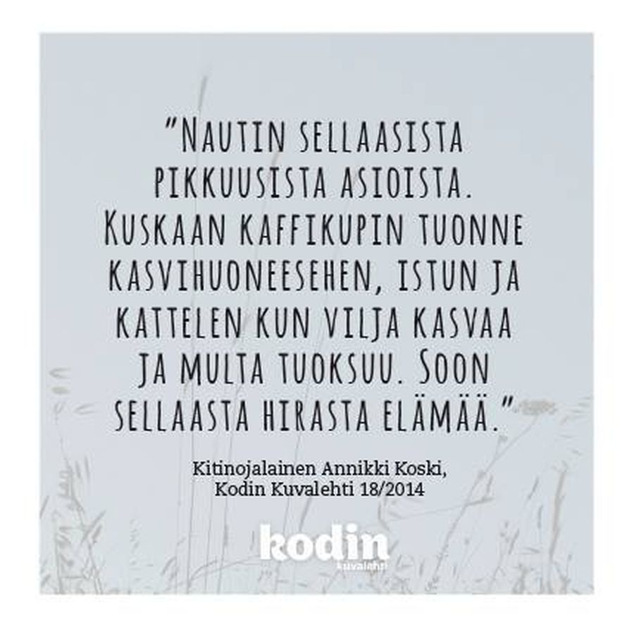 Pienistä asioista nauttimisesta 12.10.2014 klo 17:10 Mikä on sinun voimalauseesi? Kerro se meille muillekin kirjoittamalla kommenttikenttään. Tilaa Kodin Kuvalehti oivallus voimalause ajatus Tilaa Lue digilehtenä