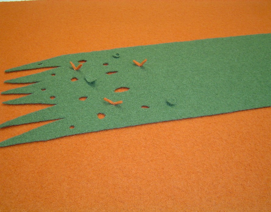 Kehitin kiireessä pikahuivin. Leikkasin aukkoja purkautumattoman keittovillakankaan suikaleeseen (ja innostuttuani myös fleeceen). Kuvioaukoilla saa näyttävän koristelun huivin päihin. Ompelin joukkoon vielä muutamia silppuja ja hyvä tuli. Ajattelin, että samaa voisi kokeilla torkkupeiton reunaan ja villakangasjakun helmaan. Nopea tehdä, eikä ompelukonetta tarvita! Kankaan löysin www.pajulahdenkangas.fi.