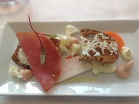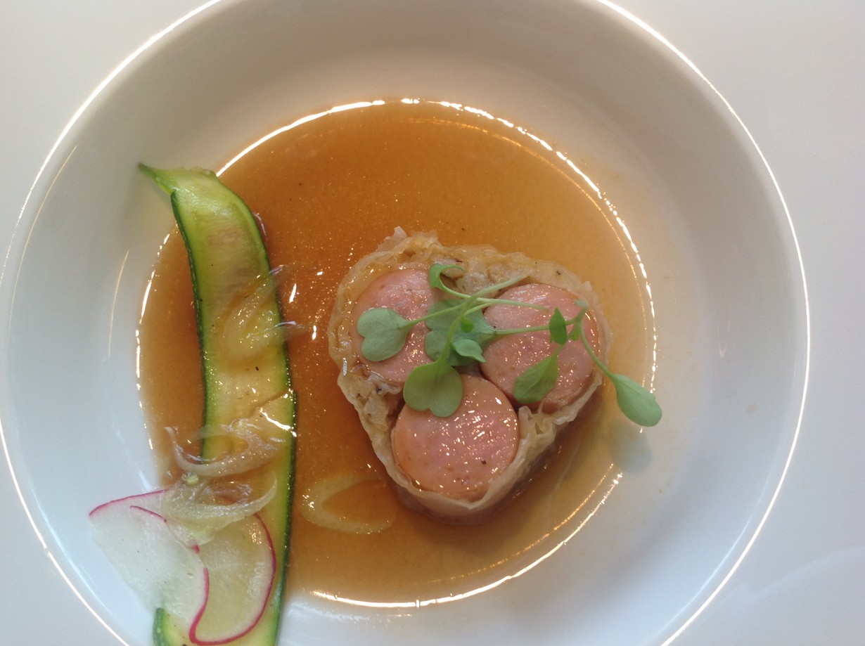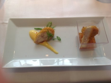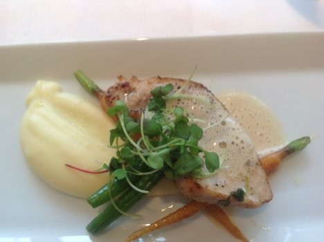 Ja vielä yrteissä paistettua broilerin fileeleikettä, piparjuuriperunapyreetä, kauden kasviksia sekä sipulivaahtoa.