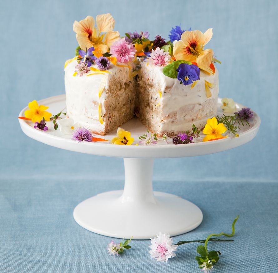 Mehevä, lohitäytteinen voileipäkakku koristellaan upeaksi syötävien kukkien avulla.