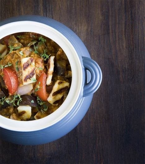Halloumijuusto ja kasvikset luovat pehmeän sopusoinnun linssi-kasvispadassa.