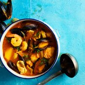 Laita liemeen ensin perunat ja keitä ne kypsiksi. Lisää sitten kalat kypsymisjärjestyksessä, viimeiseksi äyriäiset.