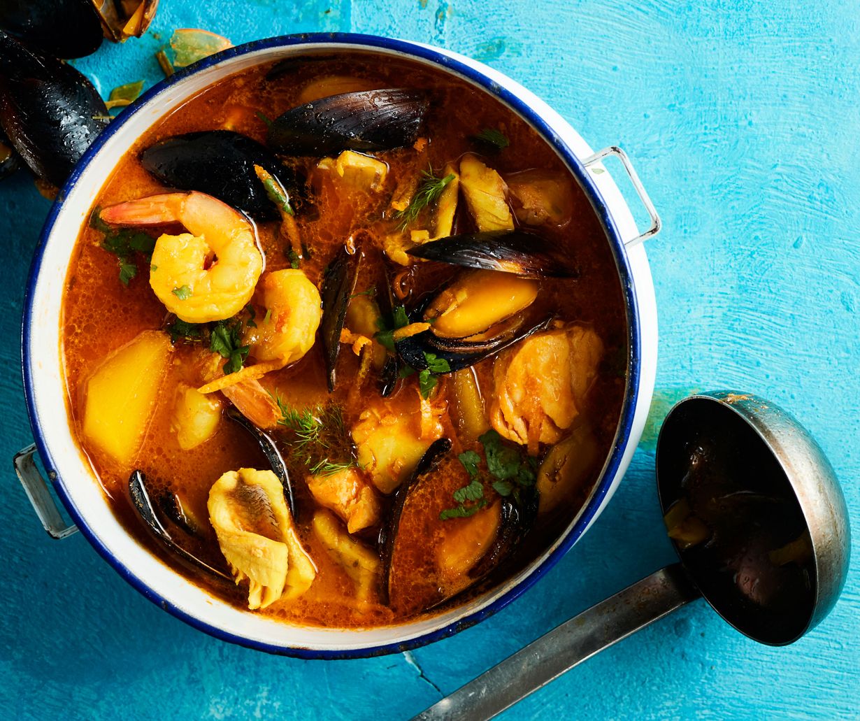 Maukas bouillabaisse, ranskalaisen keittiön klassikkosoppa, valmistetaan päivän tuoreista kaloista ja äyriäisistä.