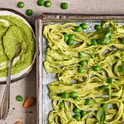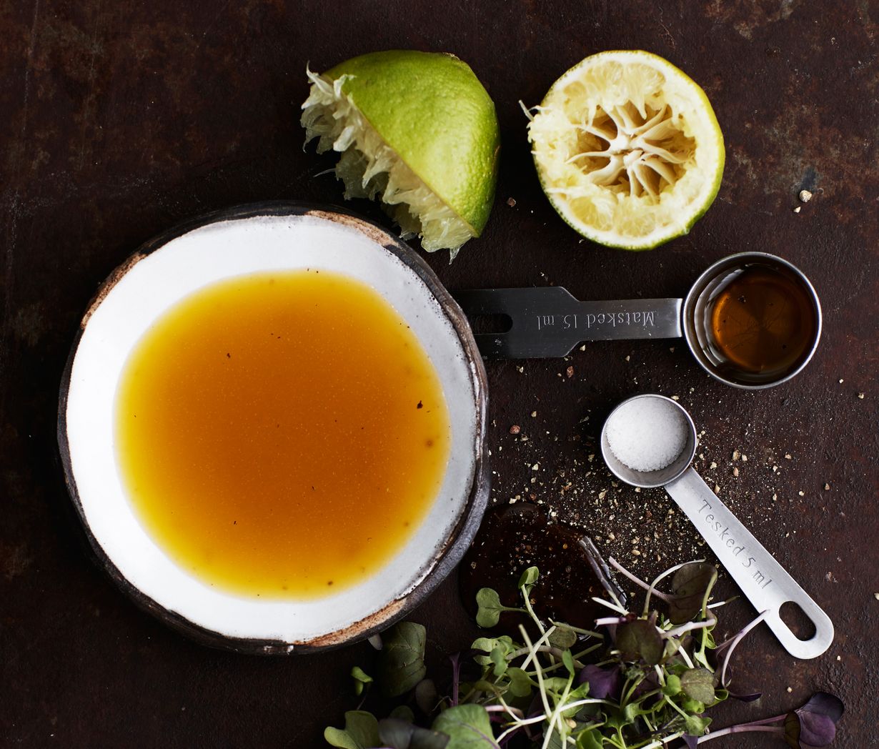 Osa öljystä voi olla pähkinä- tai seesamiöljyä. Vinegretin joukkoon voit myös soseuttaa rucolan tai yrttien varret makua antamaan.