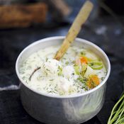 - Saosta muhennos lisäämällä siihen keltuainen. Viimeistele kermalla.