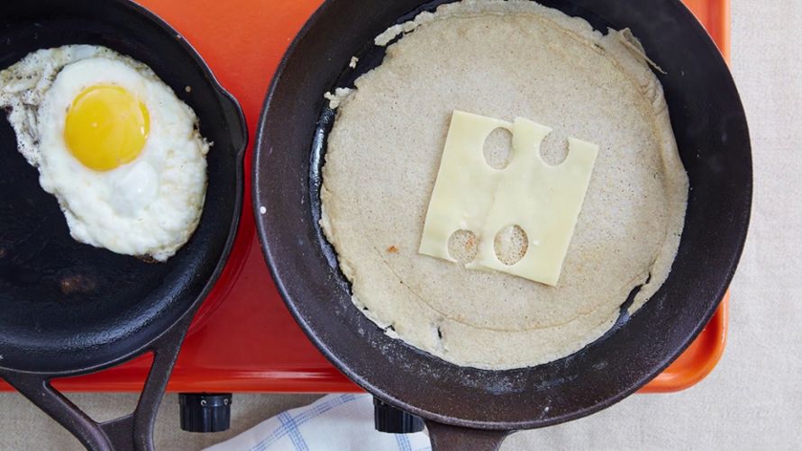 Kun juusto on sulanut, aseta päälle kinkkuviipale ja paistettu kananmuna.