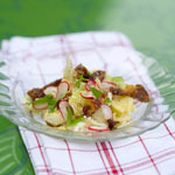 Myös broileri ja kesäkurpitsa rimmaavat loistavasti parina: tässä ohjeessa kanasuikaleet peitetään herkullisella kesäkurpitsa-purjogratiinilla.